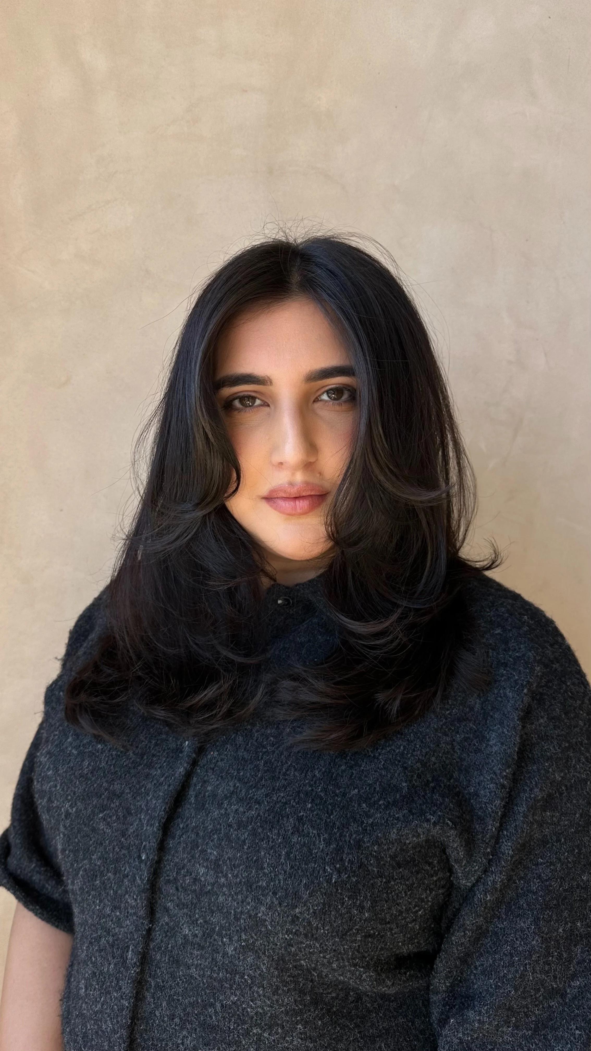 A perfectly balanced medium length with airy layers and gentle curtain bangs that frame the face like sunlight through a window—soft, flattering, and effortlessly feminine, giving your hair movement while highlighting your natural beauty.